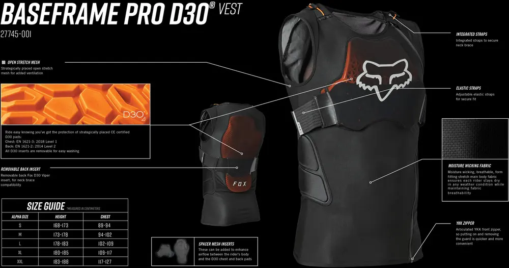 Description Veste de protection Baseframe Pro D30Protecteur D3O® absorbant les chocs avec couverture certifiée CE et ajustement précis à ton corps pour une liberté de mouvement illimitée à haute et basse températureProtecteur de poitrine certifié CE EN1621-1 niveau de performance 1Protecteur dorsal central certifié CE EN1621-1 niveau de performance 2 avec insert amovible pour une compatibilité avec les appuis-têteFermeture à glissière YKK articulée à l’avant et sangles de réglage élastiques pour un maintien sûrMatériau de base en tissu évacuant l’humidité, Tissu stretch respirant et ajusté Tissu mesh stretch stratégiquement placé pour la circulation de l’airCouche de compensation en maille sous les protections de la poitrine et du dos pour plus de confort et de respirabilitéTous les inserts de protection sont amovibles et lavablesSpécifications techniques :Année2022UsageVTTLongueurSans manches